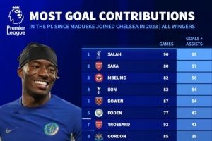 枪迷有信心吗?马杜埃凯在蓝军67场英超造20球,同期边锋仅排第30