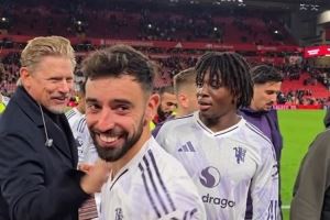 舒梅切尔赛后与拉门斯拥抱,祝贺曼联球员双红会取胜